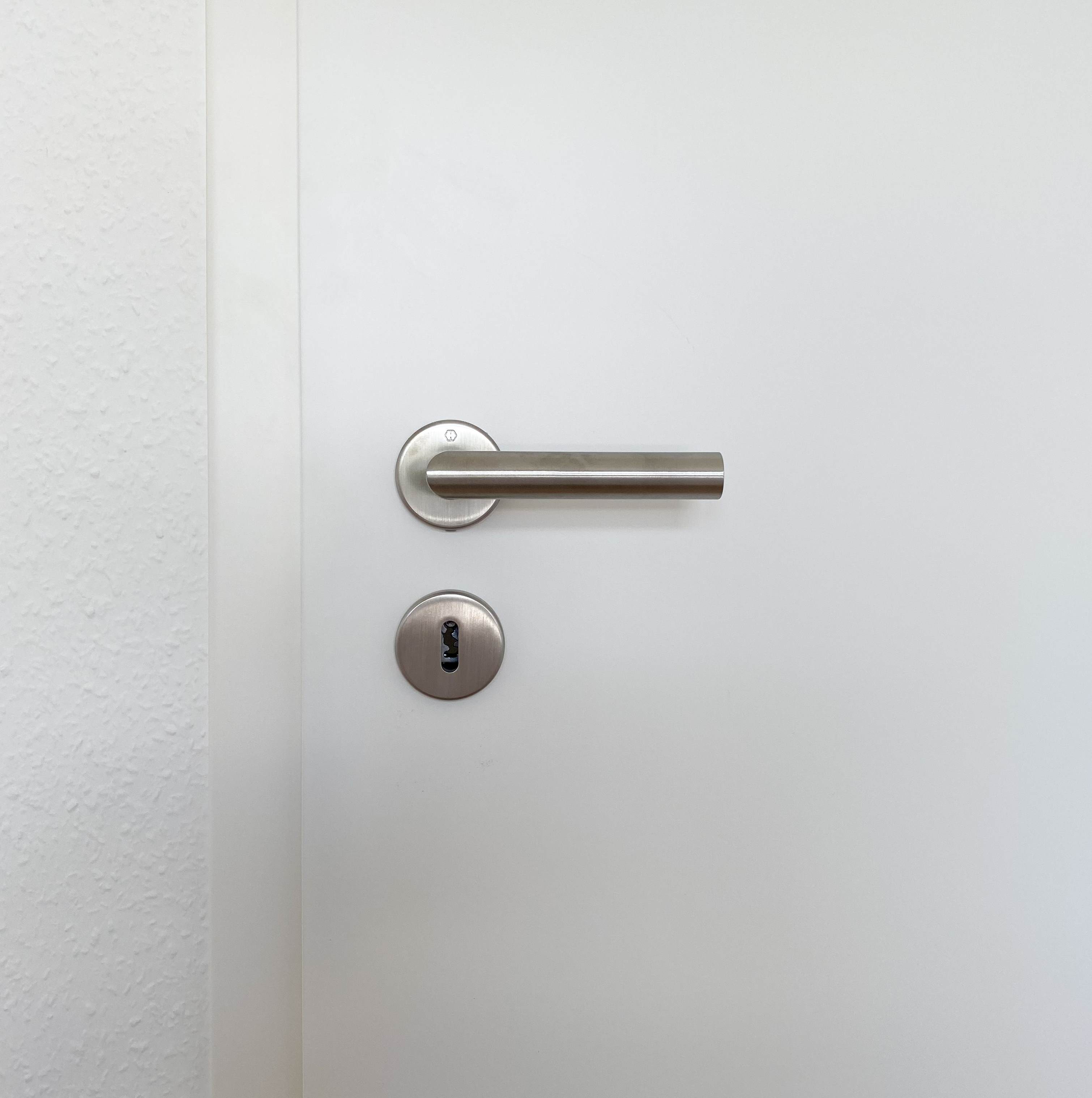 Manchmal ist es ganz gut, eine Tür hinter sich schließen zu können, ob als Abgrenzung zum privaten Bereich oder auch zwischen den Räumen. Die Ausführung der Drückergarnituren erfolgt in Aluminium. Die Holztürblätter aus Röhrenspan sind weiß lackiert und unterseitig leicht gekürzt (Unterschnitt). Bei innenliegenden Räumen ohne mechanische Entlüftung ist das Türblatt zusätzlich mit einem Lüftungsgitter versehen.